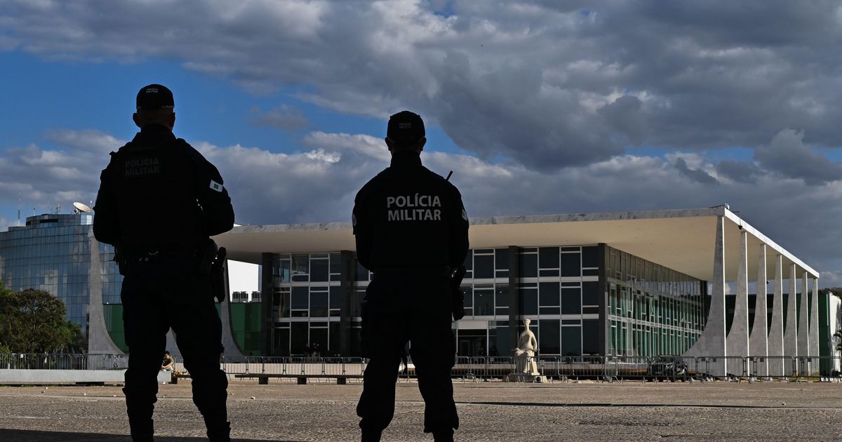 "A segurança foi reforçada em torno do Supremo Tribunal Federal, do Palácio do Planalto e do Congresso Nacional para evitar uma repetição do levante de 8 de janeiro, quando os três prédios foram saqueados por apoiadores de Bolsonaro.">