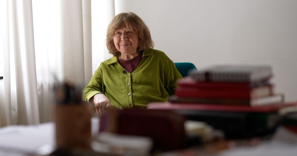 Agora com 77 anos, Svetlana Alexievich passou mais de 40 anos documentando a vida das pessoas na União Soviética e nos Estados independentes que surgiram após seu colapso. Ela registrou suas experiências na Segunda Guerra Mundial, na guerra soviético-afegã e no desastre nuclear de Chernobyl. Os livros são conhecidos coletivamente como Vozes da Utopia, em uma referência irônica ao experimento comunista de 70 anos.>