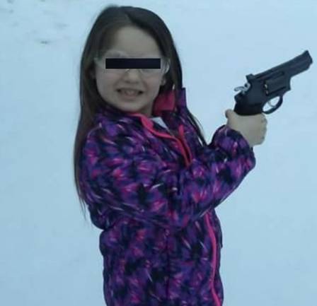 O americano postou fotos em redes sociais mostrando a menina empunhando o revólver com que fora presenteada. A mãe, Kayla, apoia a filha armada em sala de aula.>
