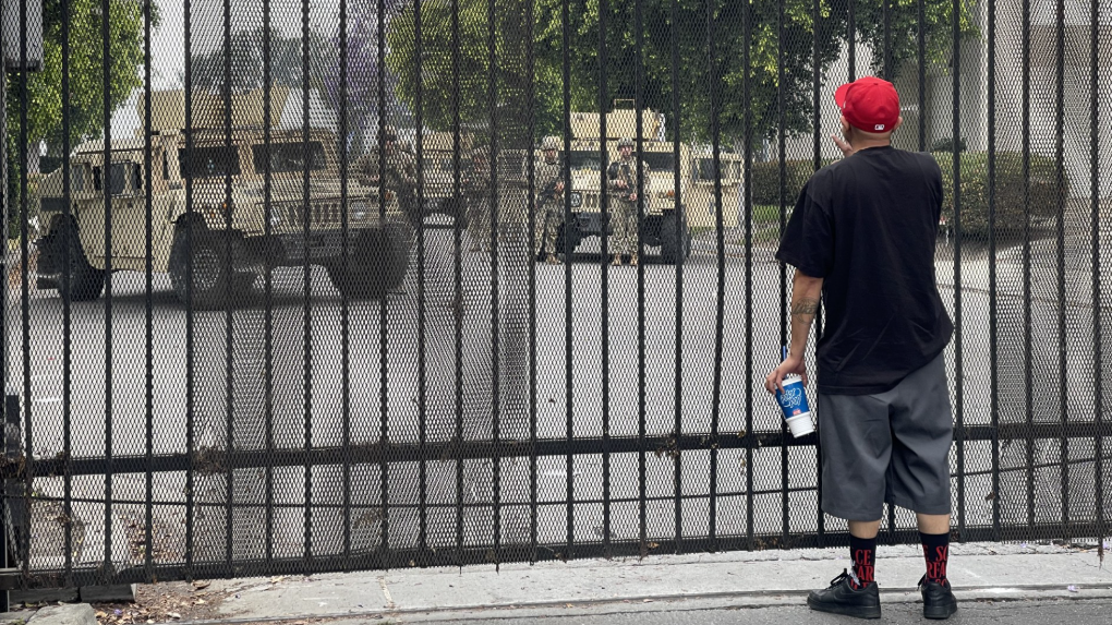 "Vocês estão indo para a guerra, com todas essas armas?", pergunta um homem aos membros da Guarda Nacional que o observam impassivelmente, com os rifles na mão, do outro lado do portão.>