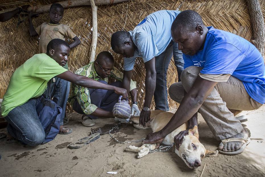 O centro considera que 60 mil cães em 1,8 mil vilarejos estejam suscetíveis à infecção. A ideia de matar os cães foi rejeitada. As pessoas precisam de seus cachorros para caçar, proteger suas cabanas de ladrões, livrar suas plantações de babuínos e afastar as hienas do gado.>