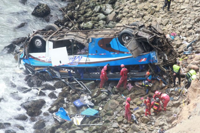 O acidente ocorreu pela manhã na "curva do diabo" da rodovia Pasamayo, 45 km ao norte de Lima. "São ao menos 25 os mortos e 5 os feridos encontrados até o momento", disse à imprensa o coronel Dino Escudero, chefe da Divisão de Controle de Estradas da Polícia.>