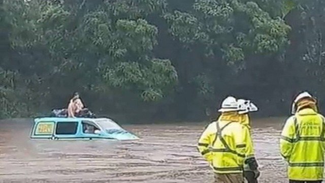 Três turistas britânicos foram resgatados após o furgão em que estavam acabar atolado em uma área inundada em Queensland (Austrália) que estava infestada de crocodilos.>