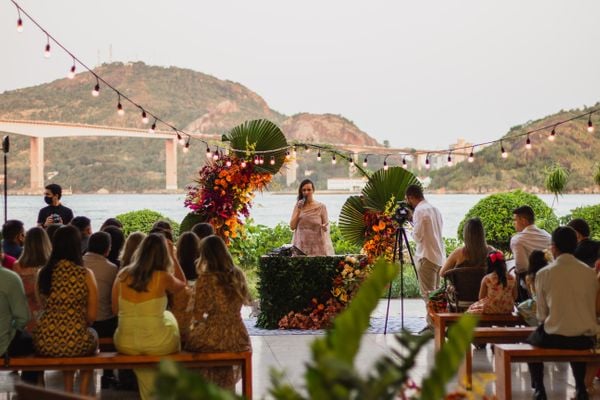 A médica Danubia Vieira da Cunha e o empresário Henrique Plazzi se conheceram numa cervejaria de Domingos Martins, onde cada um estava com seu grupo de amigos. Não nos conhecíamos, mas durante aquela noite trocamos olhares e depois de um tempo o Henrique me chamou para conversar, conta a médica. O encontro inesperado logo se tornou namoro. E, dois anos depois, eles decidiram juntos que era o momento para oficializar a união. A celebração do amor, que seria para 250 pessoas, foi reduzida para 45 convidados. Tudo por conta da pandemia do coronavírus. Chegamos a pensar em desistir, já que infelizmente teríamos que deixar muitas pessoas que gostamos de fora. Mas, ao mesmo tempo, não queríamos deixar de realizar o casamento esse ano, que foi muito importante para nós, conta. Entre os convidados apenas os familiares e amigos próximos, considerados como padrinhos. A cerimônia e recepção aconteceram num restaurante (com área externa) localizado na Praça do Papa, em Vitória, com vista para o Convento da Penha. Para a decoração do espaço, o casal escolheu dezenas de flores e móveis rústicos. O coquetel foi feito com porções de forma individualizada, evitando a exposição de alimentos e bebidas. Foi muito especial, um momento único pra nós. As pessoas que estavam ali são muito importantes. Sentimos falta de muitas outras, mas o momento que estamos vivendo não nos permitiu reunir como gostaríamos. Não pensamos em fazer uma festa grande quando a pandemia acabar. Mas quem sabe daqui a alguns anos renovamos votos com mais amigos, diz Danubia. >