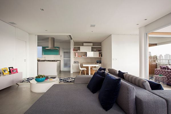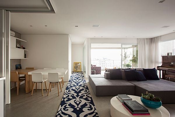 Como acomoda mais pessoas de maneira confortável, esse tipo de sofá também é querido por quem gosta de receber amigos e família. É o caso da proprietária desse apartamento, projetado por Korman. No living, estar e jantar ficam integrados, enquanto a cozinha e a varanda podem ser fechadas com as portas de correr. O sofá-ilha foi escolhido para atender a configuração aberta, principalmente nos dias em que a moradora recebe convidados. Com chaise, o modelo fica voltado para a TV e para a varanda aberta. Já a face lateral serve a sala de jantar e acomoda as visitas enquanto a anfitriã cozinha.>
