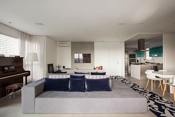 Por ficar posicionado no centro do ambiente, o sofá-ilha pode acabar ficando longe dos pontos de elétrica nas paredes. Então, quem faz questão de ter tomadas por perto para carregar o celular ou o notebook, precisa planejar pontos de eletricidade no piso, próximos às extremidades do sofá.>