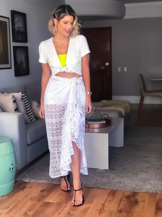 A consultora começou com um look total branco - inclusive utilizando a blusa que cortou no tutorial do abadá -, que teve um toque de cor pelo cropped verde. A produção é simples, porém nada discreta, e deixa aberta para uma composição com arquinhos, flores, ou outros acessórios na cabeça.>
