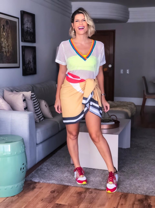 O quarto e último look trouxe mais cor a composição, que ficou por conta da blusa branca com os detalhes de arco-íris combinada a saia pareô - também mega colorida. O tênis colorido também arrematou a produção.>