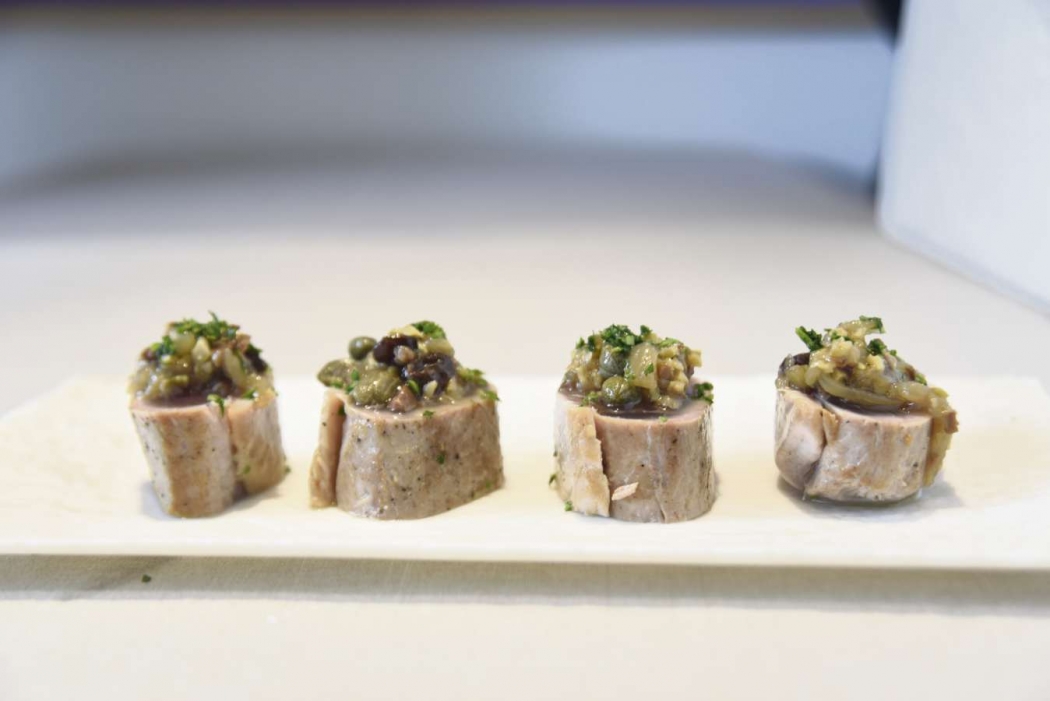 Em uma colher ou pratinho, colocar os pedaços de atum e em cima colocar o molho mediterrâneo.>