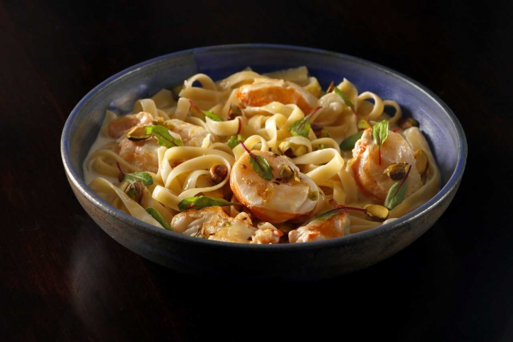 e pimenta-do-reino, vire e perfume rapidamente com o cálice de vinho branco. Acrescente o creme de leite, adicione o parmesão e depois a massa já cozida. Acerte o sal, salpique o pistache e sirva.>