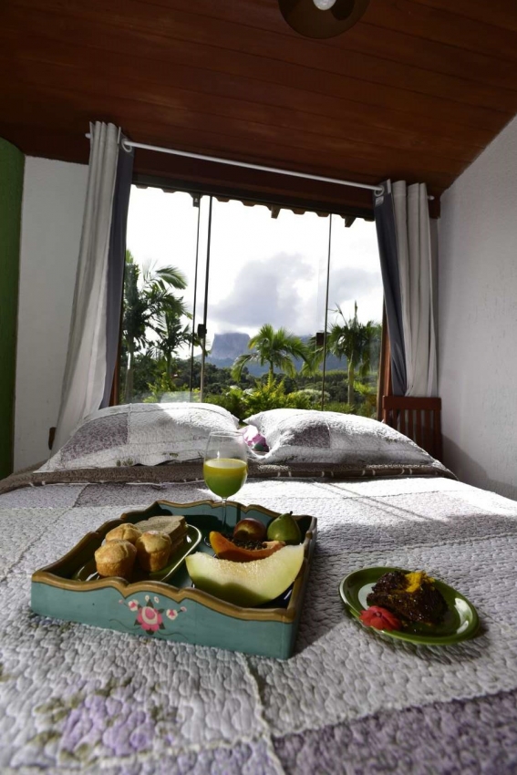 Depois de passear durante todo o dia, é hora de descansar. Há várias opções de hospedagens na Rota do Lagarto, das mais simples as sofisticadas. Mas é saindo cerca de dois quilômetros da Rota que vem a surpresa. O Bistrô e Hospedagem Vista Pedra Azul tem, como o próprio nome diz, a vista da pedra como grande diferencial para os hóspedes. Ali é o hóspede quem dita as regras. E é ele também quem dita o horário em que vai pular da cama. Nossa equipe acordou as oito horas e tomou um café colonial reforçado. Bolo de cenoura com calda de chocolate, frutas, pães caseiros, iogurte, queijos, sucos e geleias. Mas as grandes atrações são as que saem da cozinha comandada pela paraense Elizângela Alves, como o suco de laranja com duas cores e a torrada com um mini-ovo no centro.>
