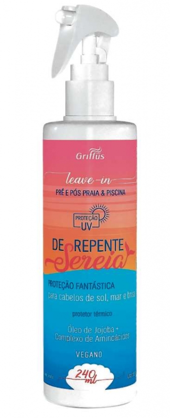 Garantir que as sereias curtam o verão, sem danificar os cabelos por conta da exposição ao sol, ao vento, ao mar e à piscina, é a proposta da linha De Repente Sereia, que a Griffus acaba de lançar. Composta por um condicionador de tratamento intensivo com ação em um minuto, um leave-in para ser usado no pré e no pós-praia e um fluido bifásico iluminador, a linha é um tratamento intensivo que recupera os cabelos das perdas hídricas ocasionadas pela exposição ao sol, sal e cloro. Resultado: cabelos macios, hidratados e brilhantes sem perder tempo e nem deixar de curtir o que estação tem de melhor.>