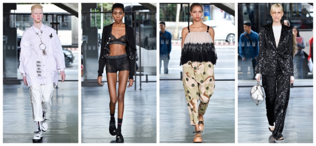 É uma coleção noturna, que tem como principal fio condutor elementos de underwear desdobrados de diversas maneiras: das formas mais simples do começo do desfile, como um look de legging branca canelada usada sob um camisão preto, até construções mais sofisticadas, como tops e vestidos esvoaçantes, longos e curtos, de tule, mostrados de um jeito despretensioso, combinados a um blazer ou uma parka-bomber, por exemplo.>