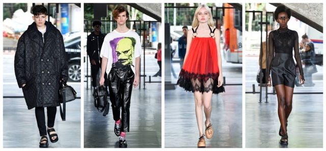 Muito legal também a estamparia com personagens e cults de terror vintage, como a Múmia, Frankenstein e O Monstro da Lagoa Negra (o filme que inspirou A Forma da Água), um momento mais pop das camisetas e moletons do desfile, que já nascem com vocação para blockbuster dessa estação.>