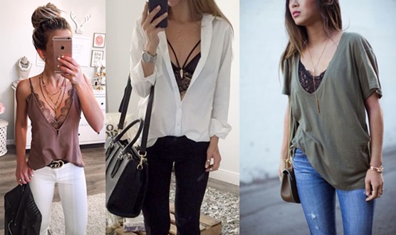 3- Básico com acessórios: A lingerie pode ser usada com uma camiseta simples de recortes mais abertos, configurando ao look uma pegada "boho sexy". Combine com jeans e tricot se quiser amenizar o ar sensual e estruturar mais sua produção. >