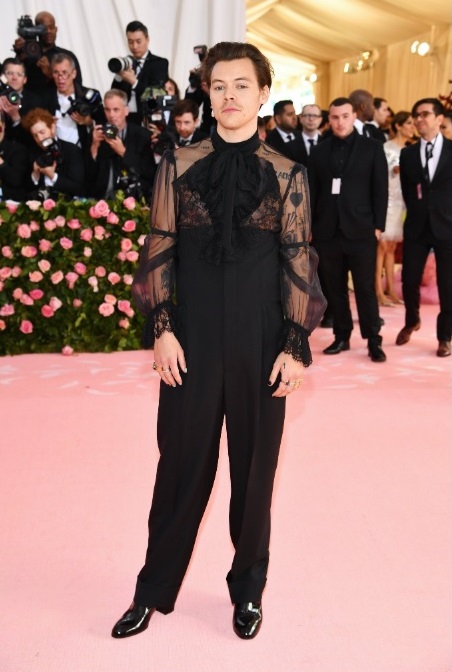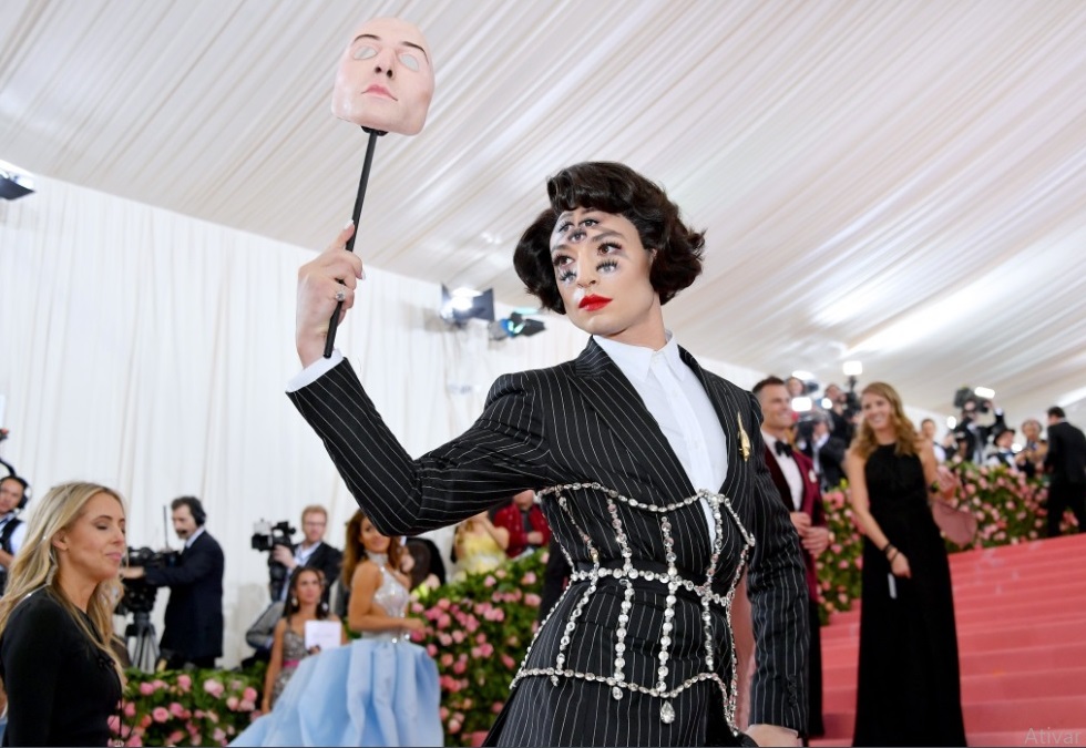 Porém, além das produções com trocas de roupa, muito brilho e makes coloridas das mulheres, os looks masculinos também chamaram muita atenção, Tanto que, na web, os comentários giraram em torno deles. Os mais ousados foram Harry Styles, Jared Leto, Billy Porter e Ezra Miller. Harry apostou em uma composição com salto alto, transparência e brincos; Jared levou sua própria cabeça, uma reprodução de cera, na mão; Billy chegou em uma carruagem estilo Cleópatra com um macacão dourado e uma asa de três metros de altura. E Ezra fez uma maquiagem que dava ilusão de vários olhos.>