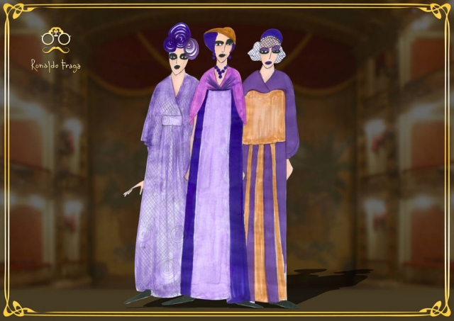 O ponto de partida para a criação dos looks dos personagens foi a cor roxa, representativa, na opinião de Ronaldo, dos temas abordados pelo espetáculo (paixão, morte, conflito de classes). Assim, ele definiu uma cartela que vai de tons mais claros aos mais profundos da cor, combinada a roupas com um toque de época, referências ciganas e à cultura amazônica. "Decidi incluir um toque paraense nas criações, que pode ser notado nas estampas ou no urubu do Mercado Ver-o-Peso bordado na mortalha da personagem principal", revela Ronaldo.>