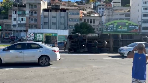 Carreta tomba após sair de curva na Vila Rubim em Vitória; vídeo